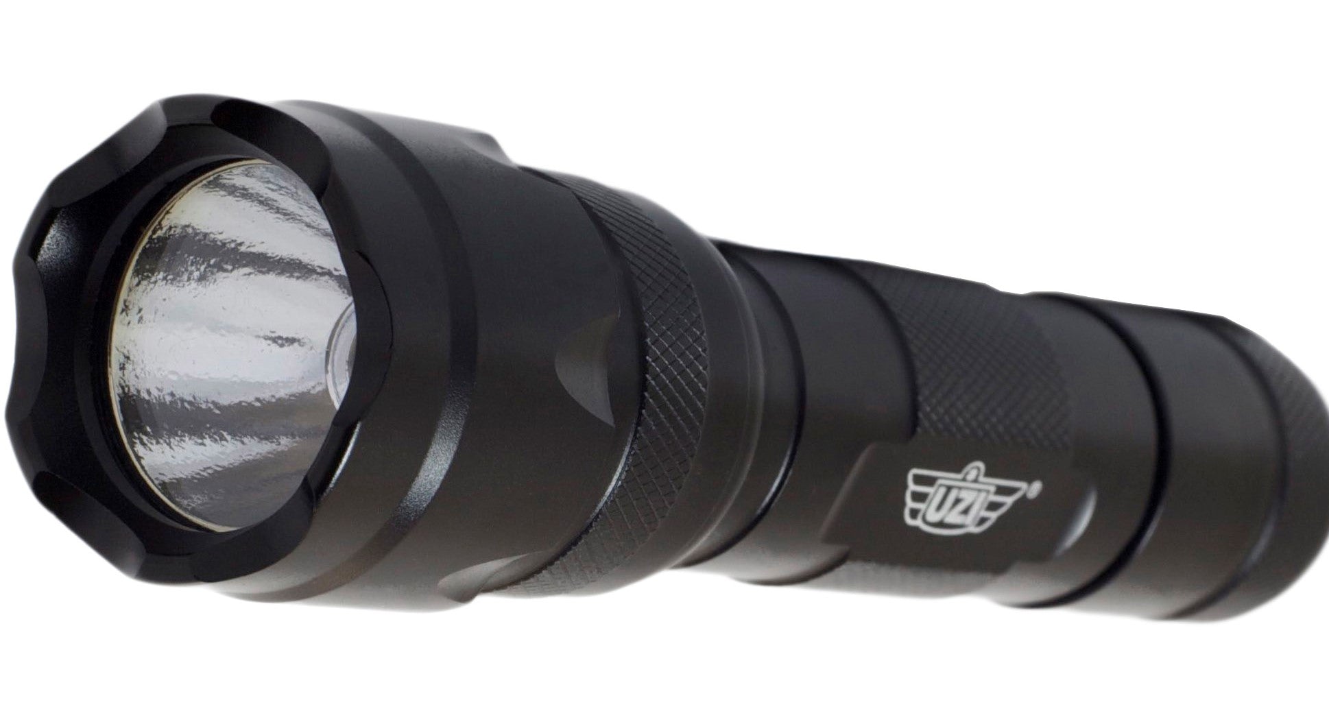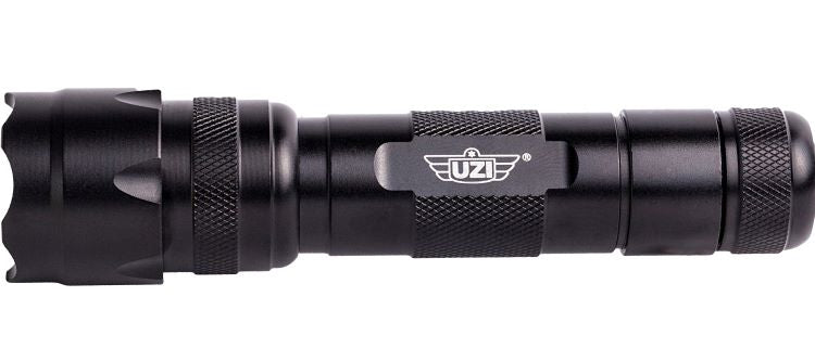 UZI tactical 200 lumen LED flashlight with high and low settings and strobe feature. Aircraft aluminum body, water and shock resistant, 5 1/4 inches long. Includes 2 - CR123A batteries and ballistic nylon pouch. Ideally suited to the security industry, these flashlights are made for duty.